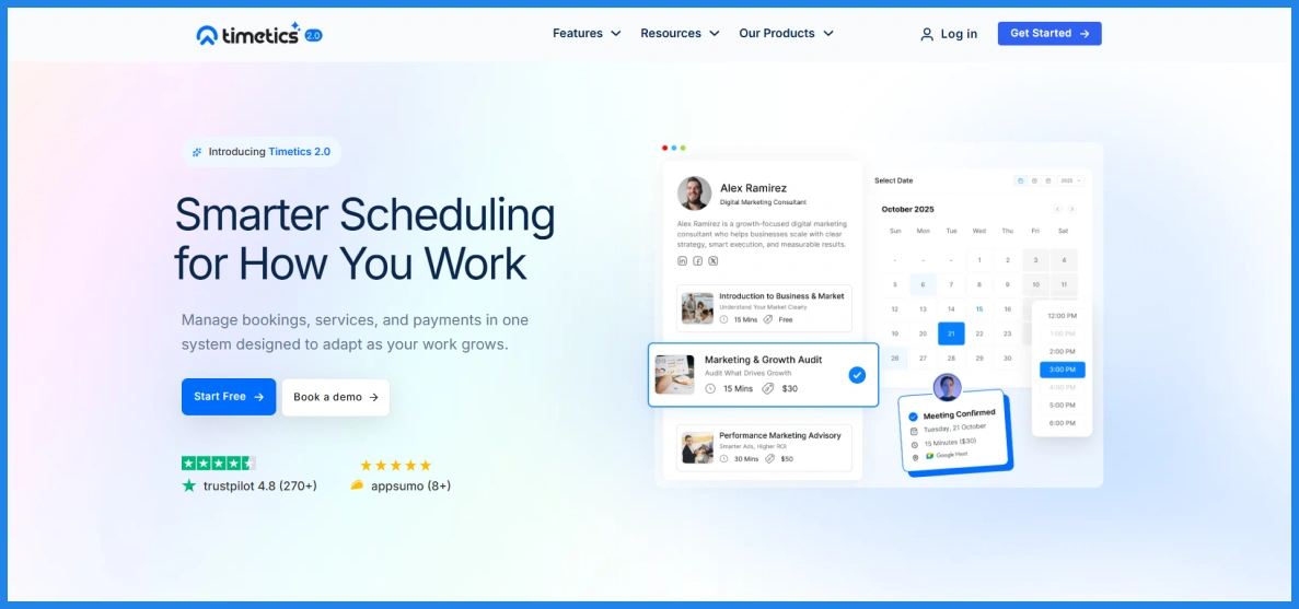 If you want a standalone, AI-powered appointment scheduling software that handles services, teams, and event-based scheduling, Timetics.ai is worth considering. It’s built for businesses that need more automation and smarter availability management beyond basic meeting scheduling.