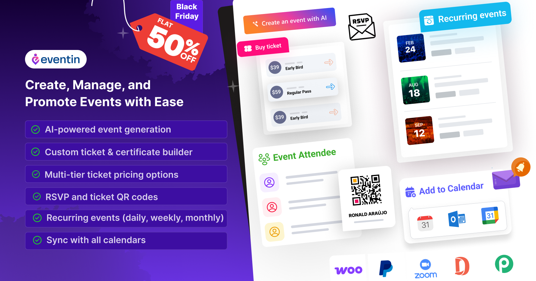Eventin is a powerful Event Management Plugin for WordPress that simplifies Organizing Events. It features a Multivendor Event Marketplace with Multi-tiered Ticketing, RSVP Calendar, Recurring Events, and integrations with Google Meet, PacyPal, and Zapier. Enjoy a 50% discount for Cyber Monday, and effortlessly create events for your attendees.