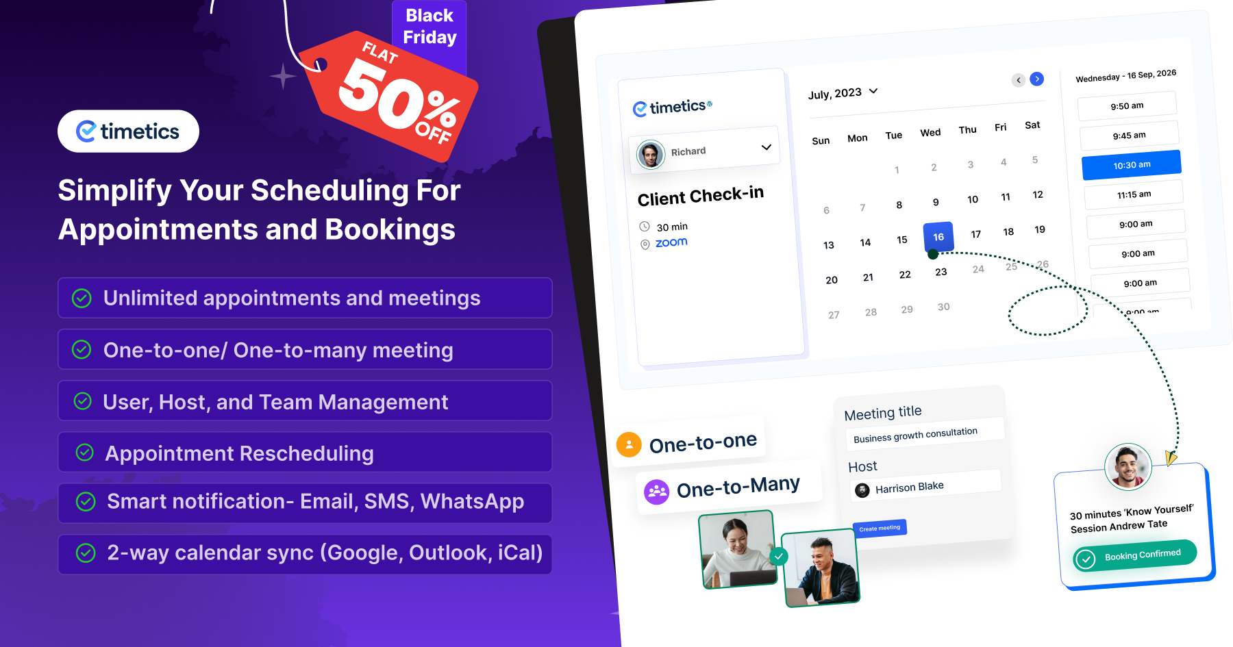 WP Timetics is an advanced Appointment and Booking Plugin for WordPress that simplifies Online Scheduling. It features Unlimited Meetings, Google Meet and Zoom integration, Visual Seat Plans, Automated Notifications, and many Payment Methods. Enjoy a 50% discount for Cyber Monday and streamline your appointment scheduling today!