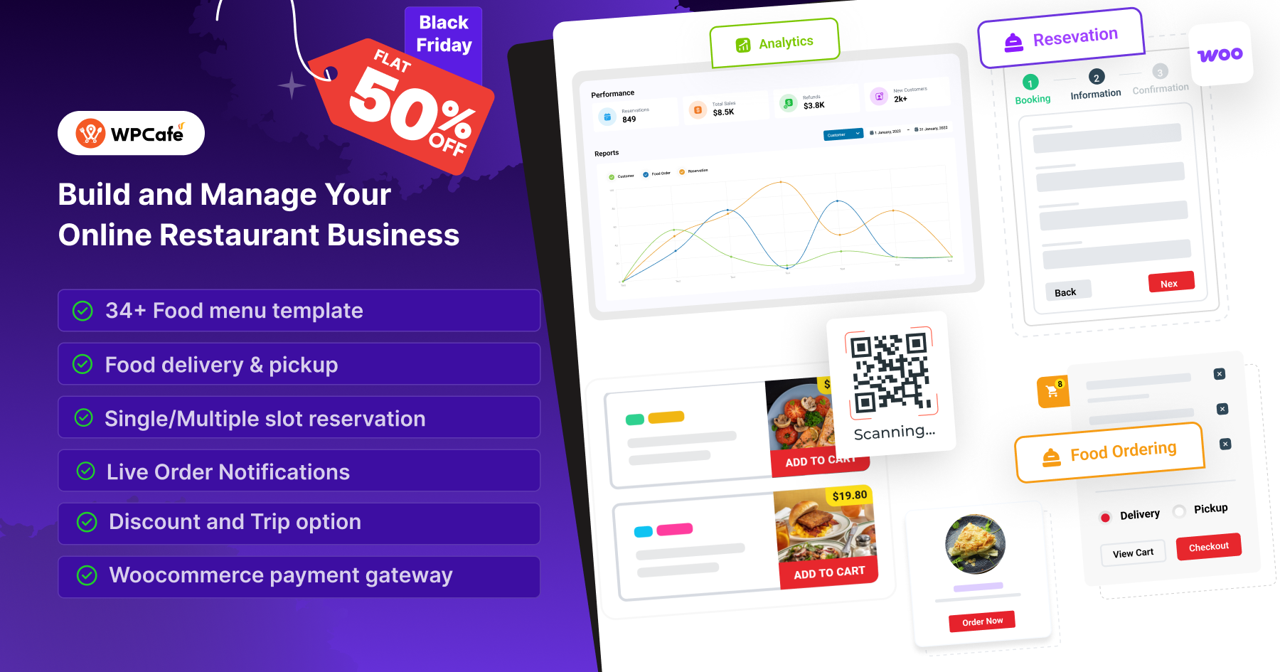 WPCafe is a versatile Restaurant Management Plugin for WordPress that enables Online Food Ordering, Reservations, and Customizable Menus. It features Pickup/Delivery options, QR Code Ordering, and easy WooCommerce integration. Get a 50% discount for Cyber Monday to boost your food business sales!